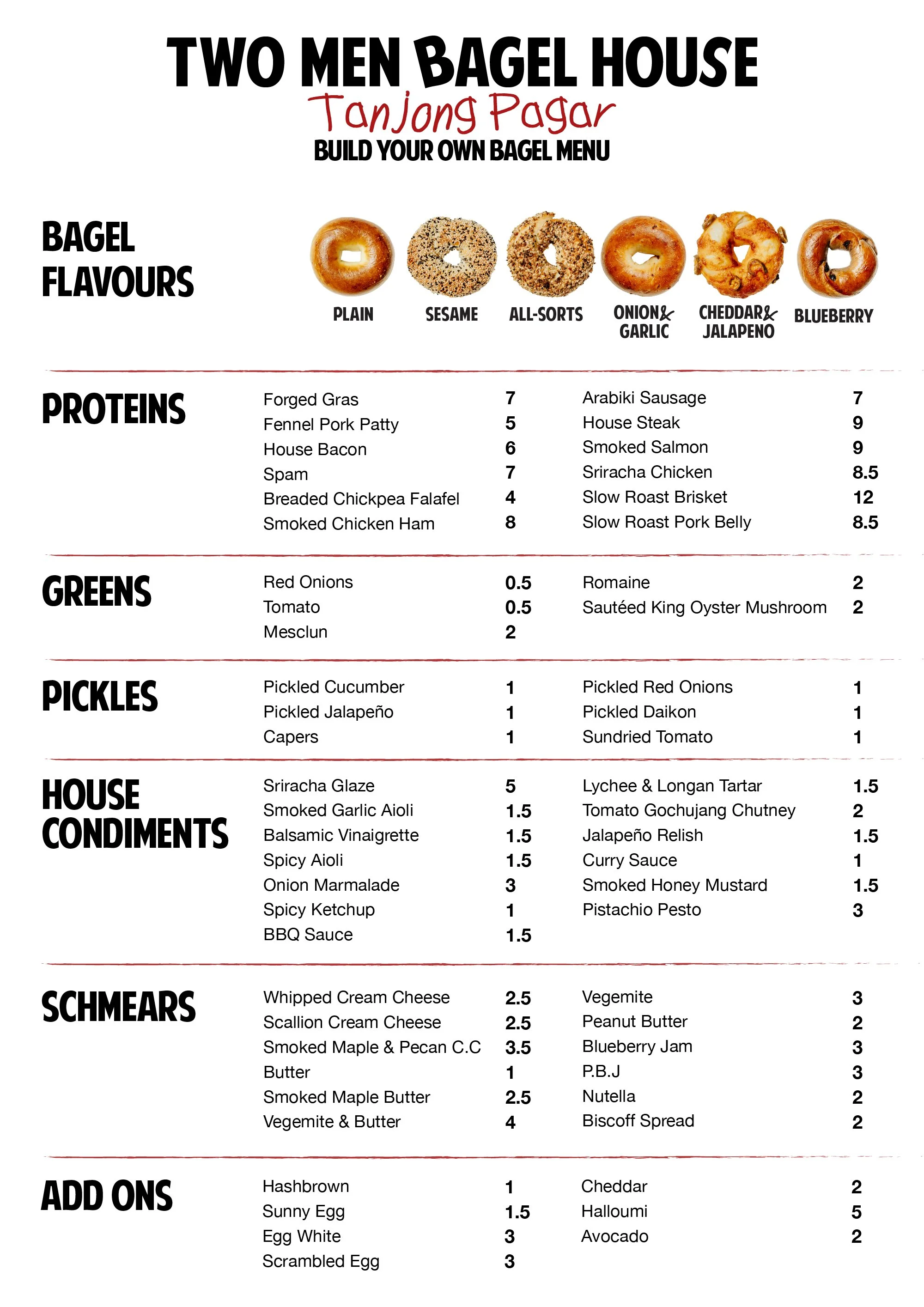 TANJONG PAGAR Artisanal without the bullshitBaked fresh daily; made the hard way.An appreciation of culture, foodand creativity through bagels. THE OTHER MENUS Novena | Holland Village | Joo Chiat | Alley BayORDER NOWGrab | Deliveroo